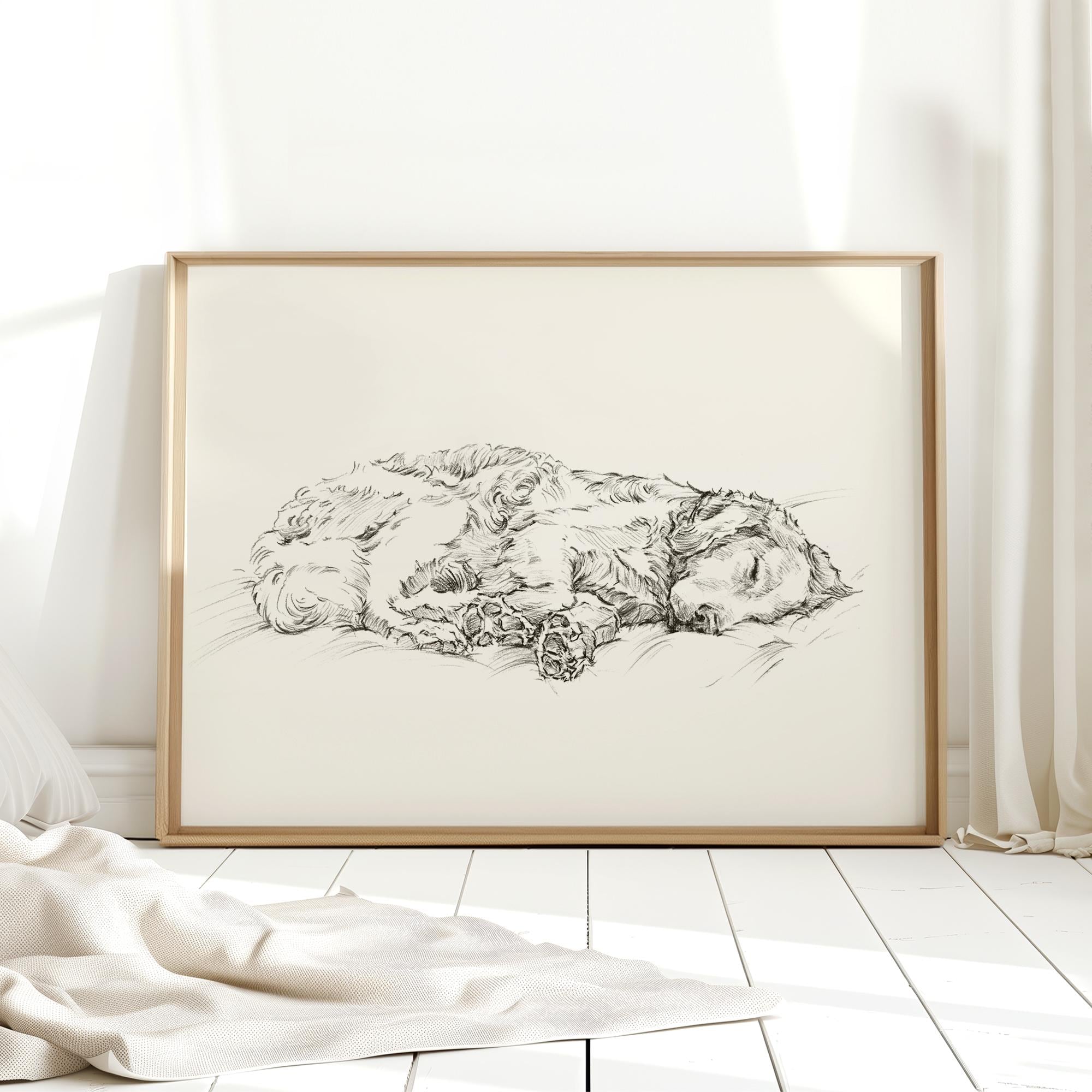 This print features an adorable pencil sketch of a dog doing what dogs do best; napping the day away! This is an Open Edition print of an original pencil drawing by artist Ethan Harper