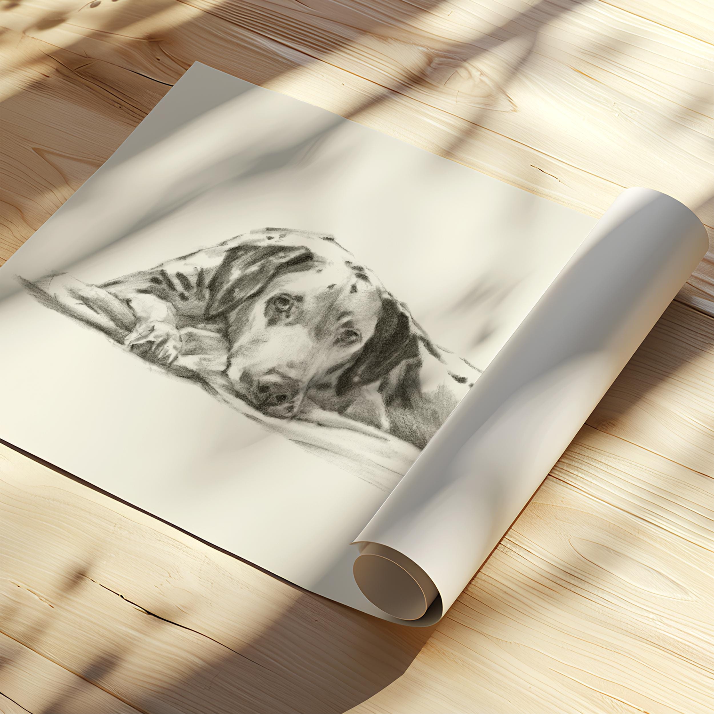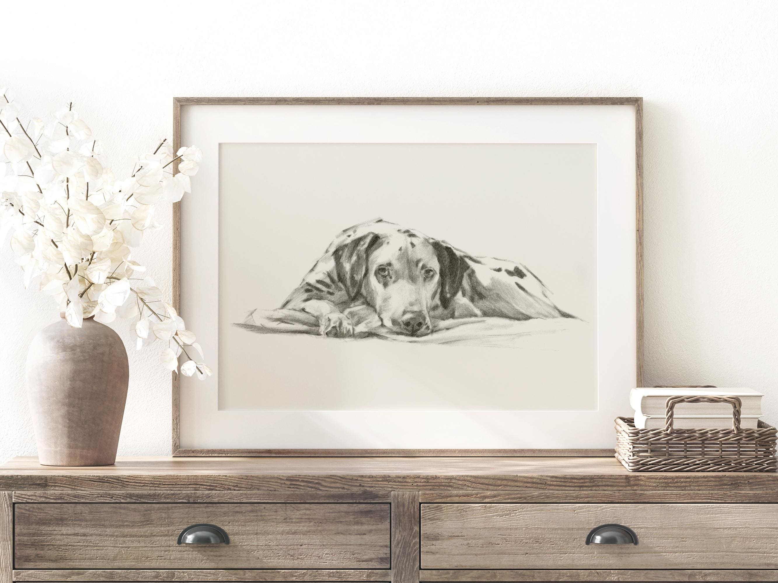 Its timeless black-and-white sketched style on light beige paper makes it a versatile choice for various interior styles, from modern to rustic. Whether you're seeking a heartfelt gift for a pet lover or a lovely piece to celebrate your family dog, this artwork offers a heartfelt and sophisticated touch.