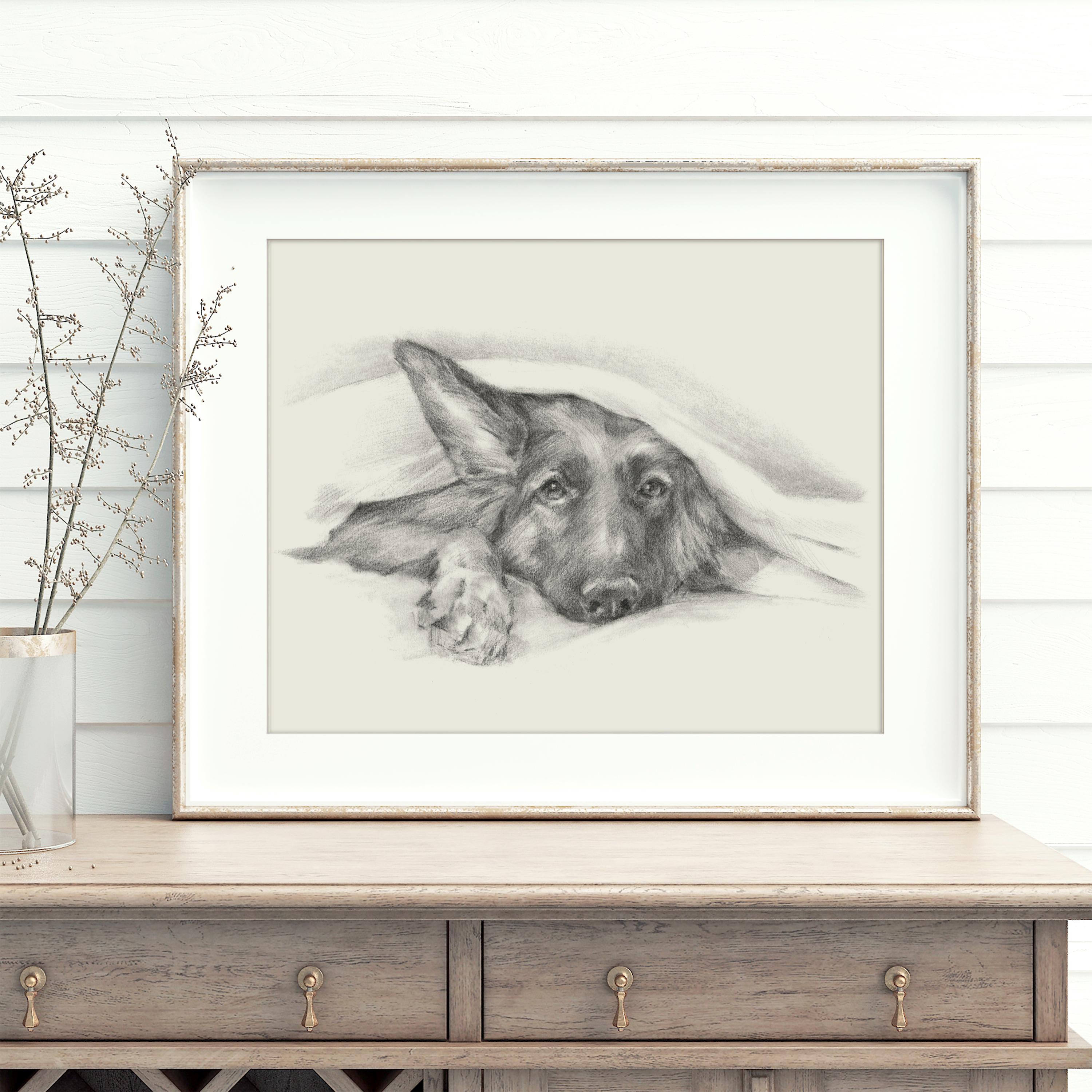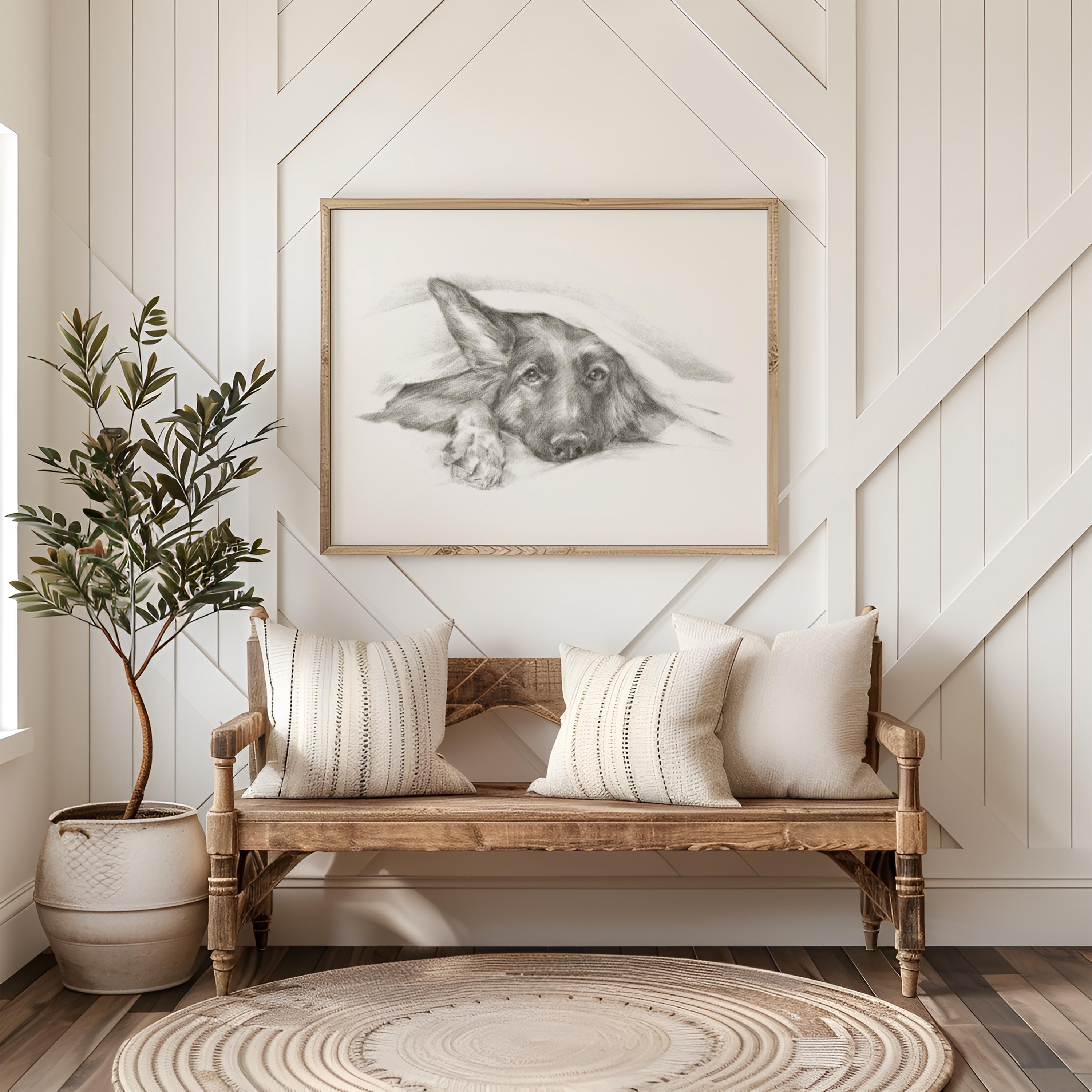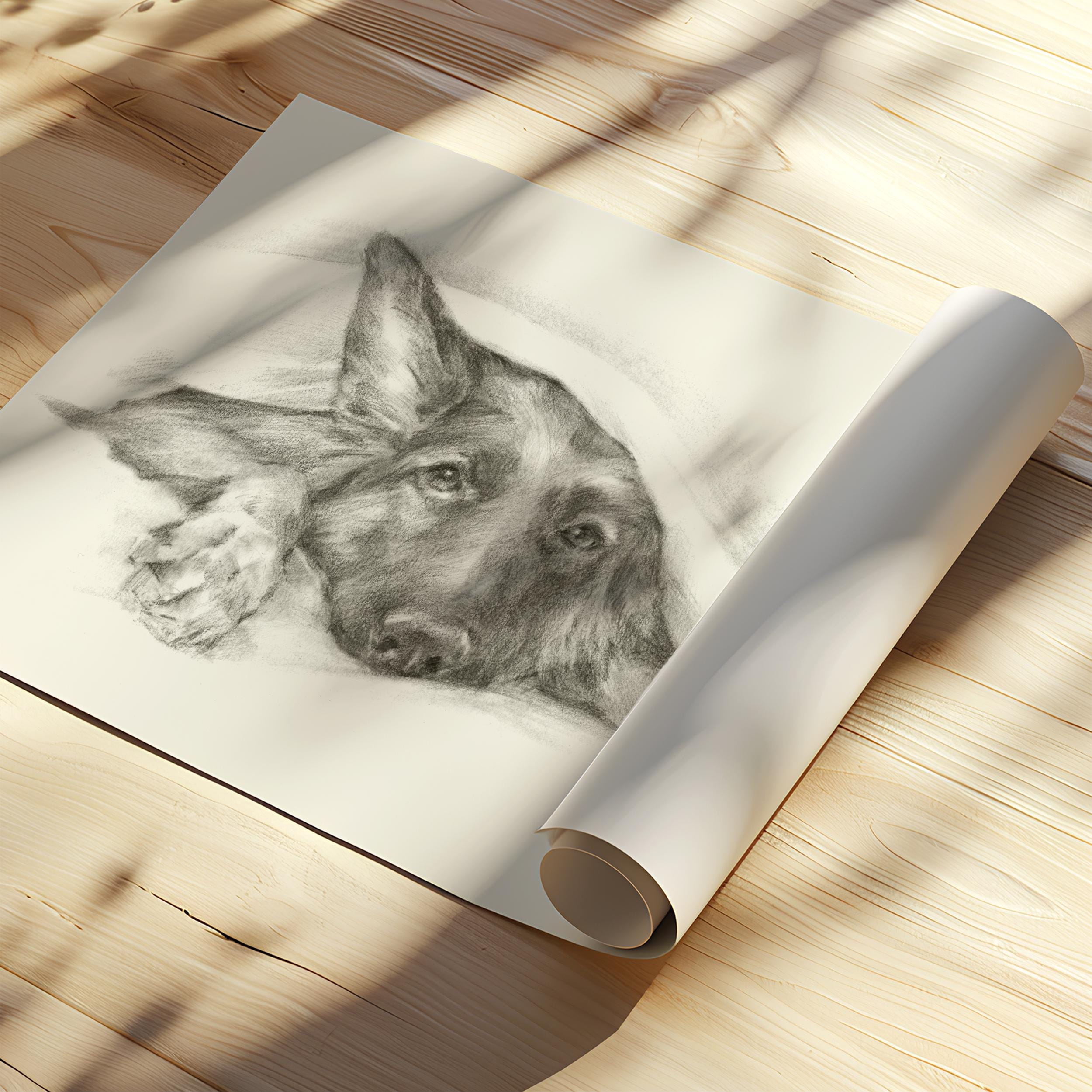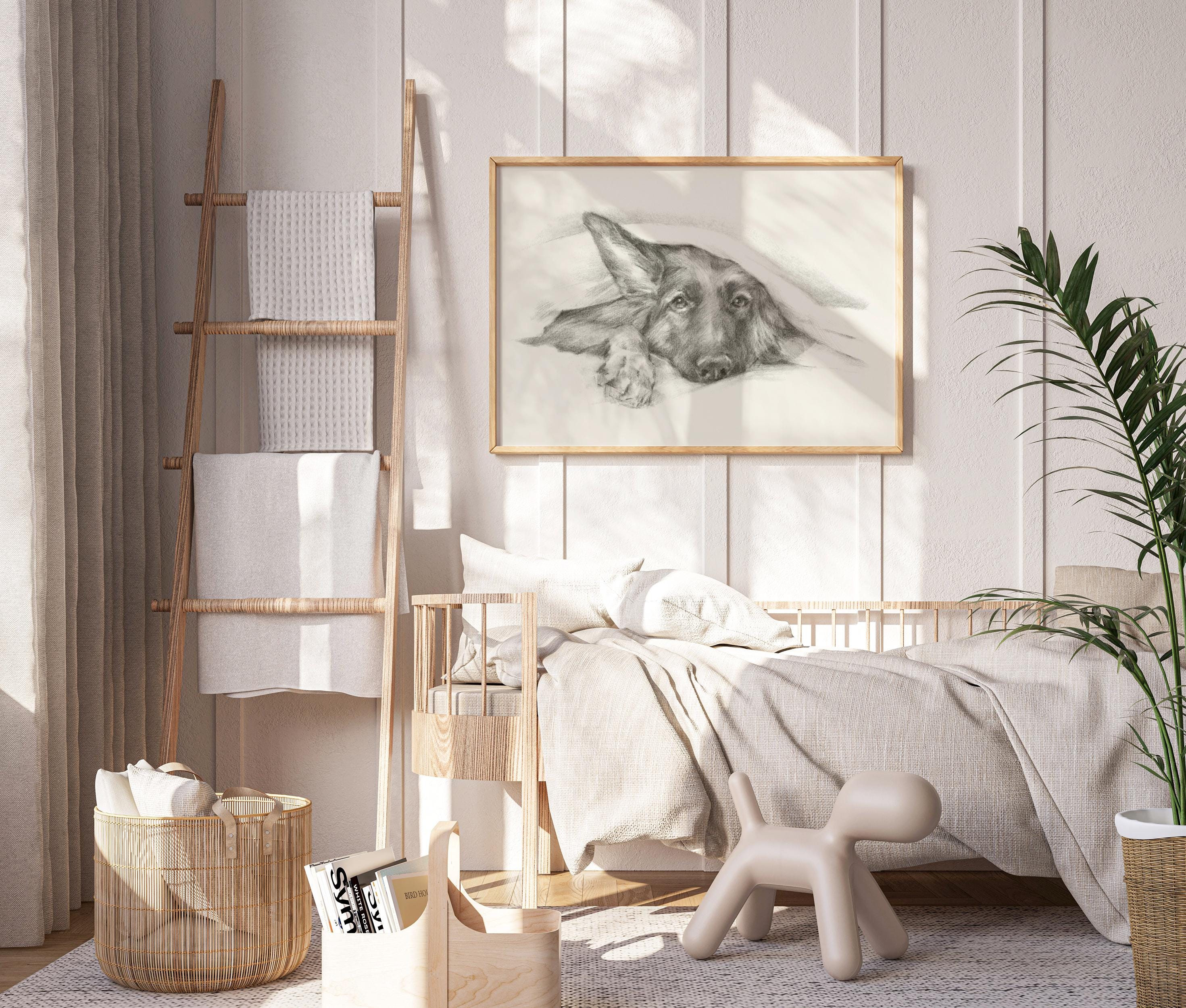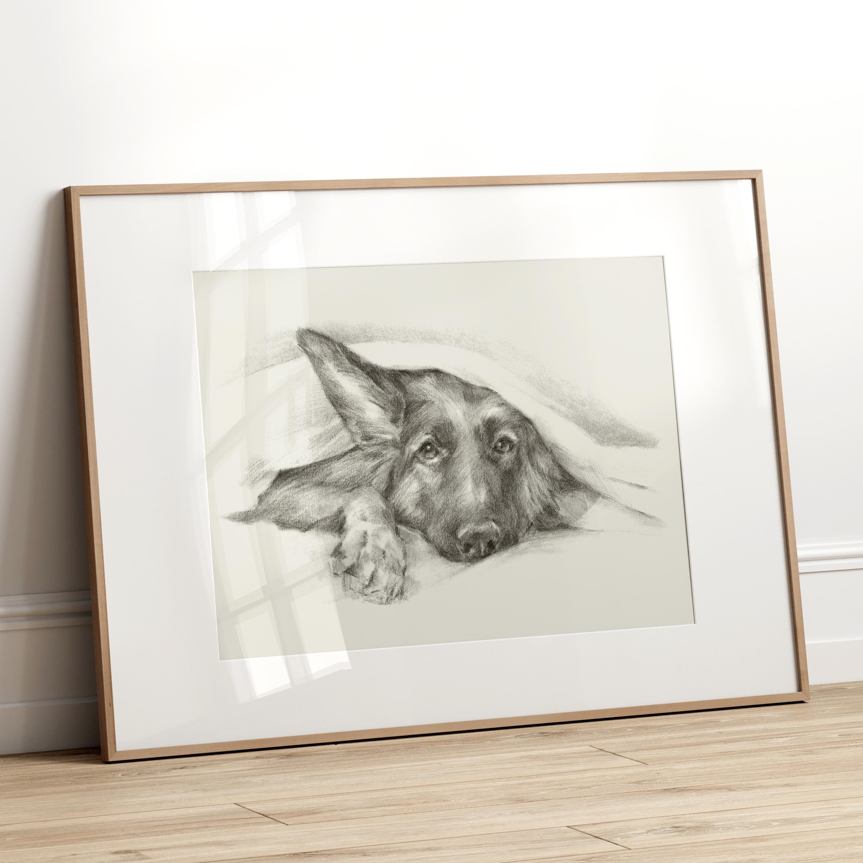Its timeless black-and-white sketched style on light beige paper makes it a versatile choice for various interior styles, from modern to rustic. Whether you're seeking a heartfelt gift for a pet lover or a lovely piece to celebrate your family dog, this artwork offers a heartfelt and sophisticated touch.