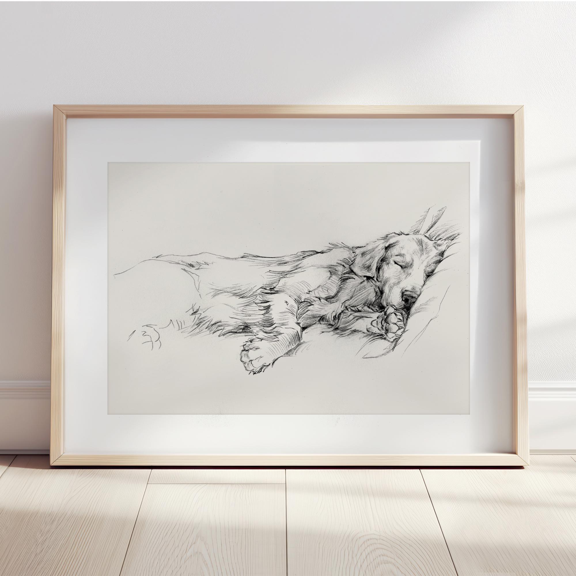 Capture the warmth and charm of your favorite companion with this exquisite golden retriever art print, titled "Dog Days", by Ethan Harper, featuring a finely detailed sketch that highlights the breed’s gentle expression and flowing fur. This elegant dog sketch brings a timeless, artistic touch to any room, setting it apart as a heartfelt pet portrait and a unique gift for dog lovers.