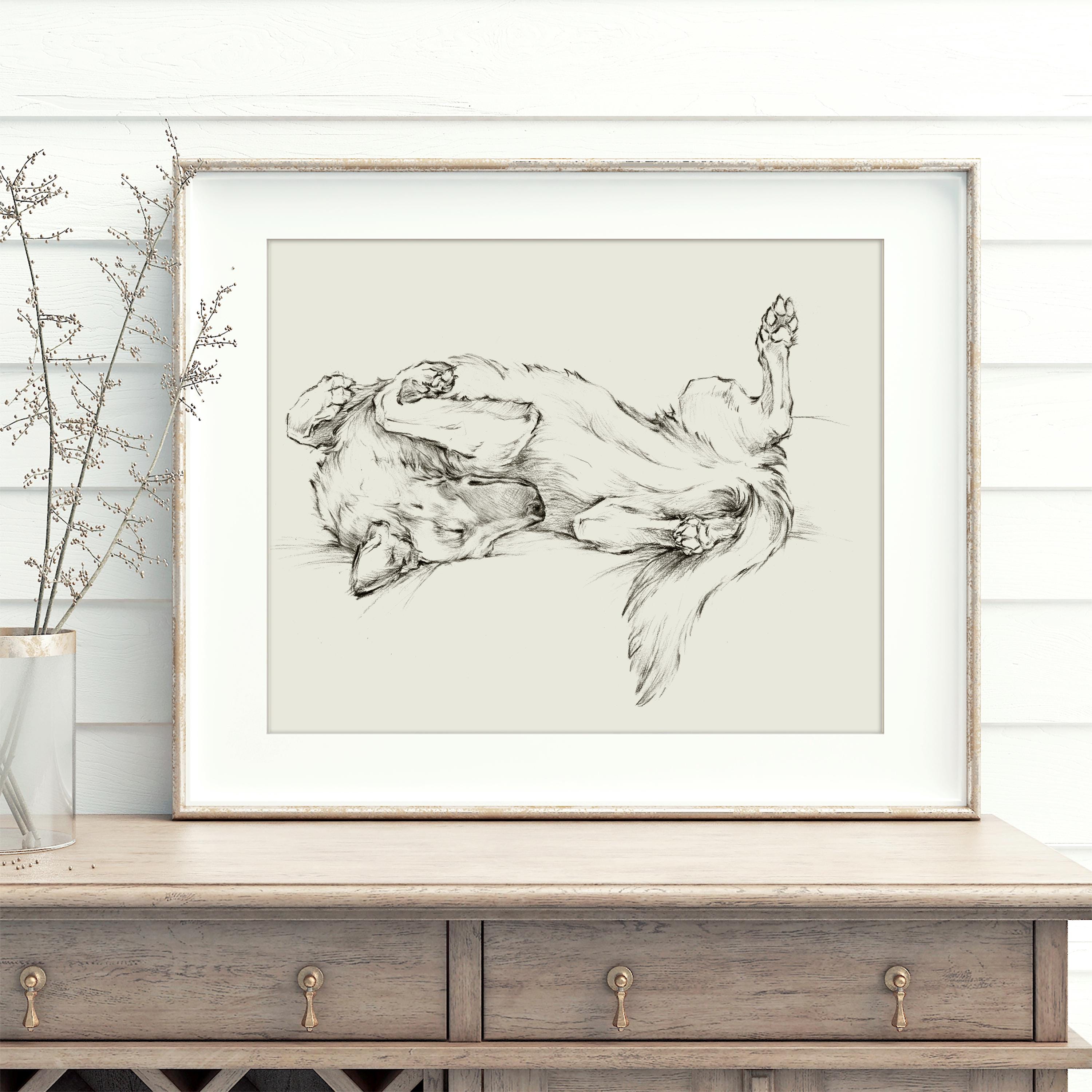 Witness the playfulness of a German Shepherd napping on its back, paws in the air, in this open-edition Giclée print by artist Ethan Harper. Celebrated for his ability to capture the essence of what it is to be a dog, Harper’s sketch-style artwork beautifully conveys the loyalty, joy, and spirit of this beloved breed. Perfect for dog lovers and art enthusiasts alike, this print adds a whimsical touch to nurseries, homes, or offices.